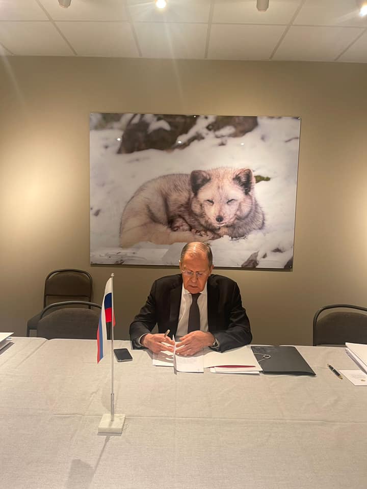 Официальный представитель МИД России Мария Захарова опубликовала в Facebook фотографию министра иностранных дел России с фотографией песца на заднем плане.