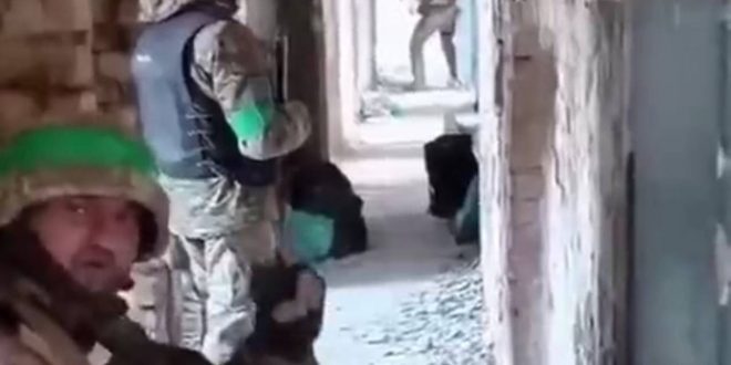 Как утверждается, запись сделана 23 марта. На ней видно, как укрывшиеся в полуразрушенном здании украинские военные, которых можно опознать по зеленому скотчу на форме, отстреливаются от наступающих бойцов Вооруженных сил (ВС) России.