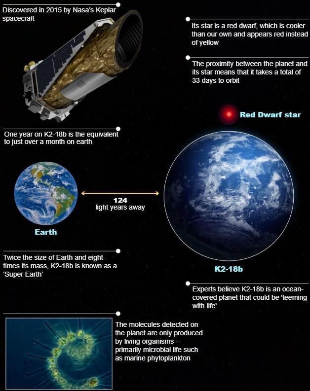 Экзопланета K2-18b, о которой идет речь, расположена в созвездии Льва и вращается вокруг своей звезды на расстоянии 124 световых года от Земли. Команда под руководством профессора Кембриджского университета Никку Мадхусудхана исследовала ее с помощью космического телескопа «Джеймса Уэбба» (JWST) и обнаружила в атмосфере химические следы веществ — метана и углекислого газа, — связанные с наличием живых организмов.