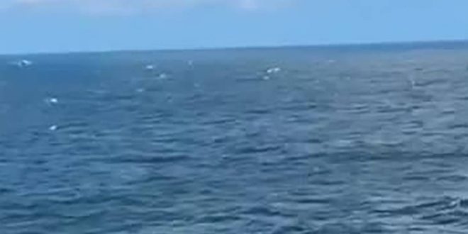 На видео видно, как российский бомбардировщик пролетает близко к поверхности моря и выпускает два снаряда.