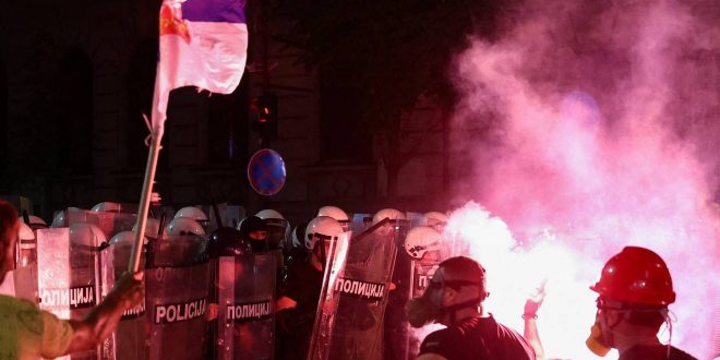 По данным агентства, правоохранители применили силу против демонстрантов и вытеснили их с улицы Кнеза Милоша. Протестующие, в свою очередь, забрасывают полицейских камнями и петардами, пытаются прорвать кордон жандармерии.