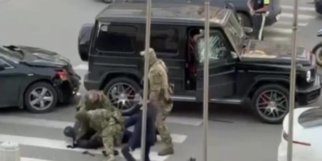 В ролике видно, как силовики подбегают к «гелику» и требуют от людей, находящихся в салоне, выйти из автомобиля. Затем они начинают бить молотком по стеклам, а водитель в этот момент пытается скрыться, включив задний ход. В результате машина врезается в стоящее сзади авто, а также сбивает с ног одного из сотрудников спецназа. После этого его коллеги набрасываются на Mercedes и вытаскивают из салона Шихлинского.