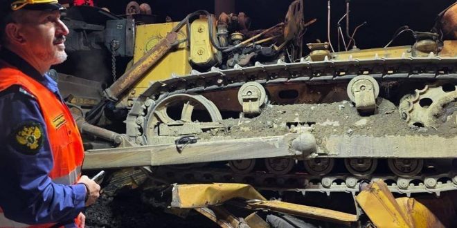 На кадрах видно, как люди идут мимо искореженного бульдозера.