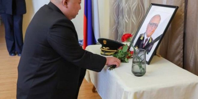 Глава государства выразил соболезнования из-за смерти российского посла в республике Александра Мацегоры. На распространенных официальным новостным агентство фотографиях видно, что Ким встал на колено перед портретом дипломата и возложил траурный букет.