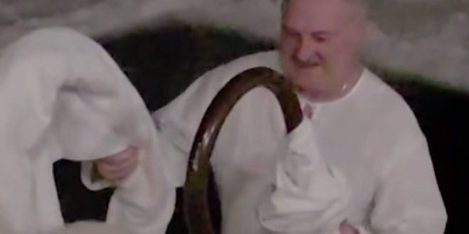 Уточняется, что глава государства окунулся в прорубь в пятнадцатиградусный мороз. Он был одет в длинную белую рубаху.