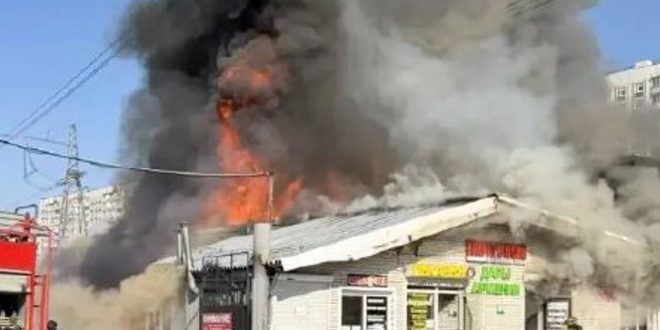 О пожаре в Подмосковье стало известно ранее 20 марта. На появившихся в сети кадрах можно увидеть горящие павильоны, от которых валит густой черный дым.