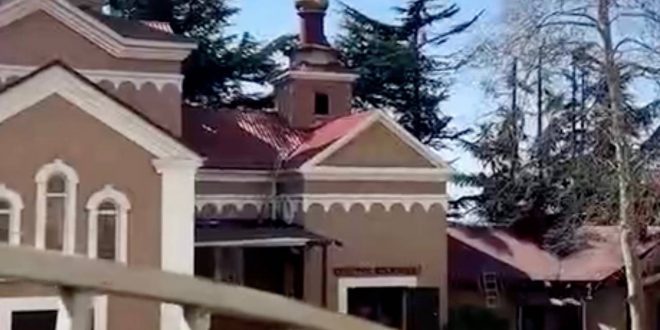 На кадрах видно здания с посеченными стенами и выбитыми окнами, включая один из местных храмов.