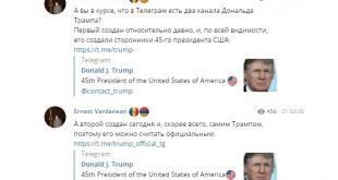 Telegram-канал с постами в Twitter президента США Дональда Трампа появился от неизвестных авторов. Утверждается, что он принадлежит политику, но доказательств этого нет. Ранее у главы государства был удалён Twitter-аккаунт. Подпись на канале гласит «45-й президент США» и на него подписались порядка 300 тысяч человек. В дальнейшем на канале появилась ссылка на сервис мошенников. Аккаунт Дональда […] Сообщение В Telegram появился канал с постами Дональда Трампа появились сначала на Информационно-аналитическое издание SM.News.